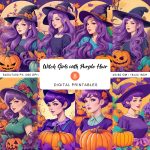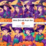 Introducing our enchanting collection of Halloween printables featuring Black Witch Girls with Purple Hair!